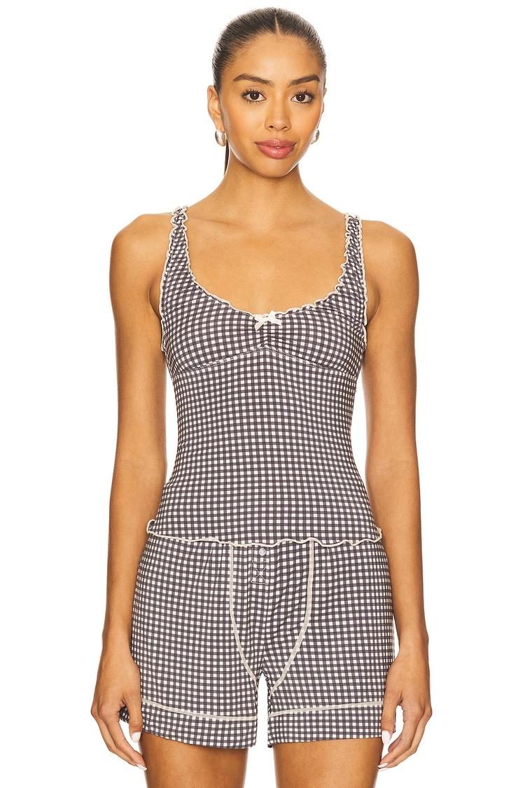 Soft modal blended with a touch of spandex creates a fitted tank top featuring a classic scoop neck and wide straps for comfortable wear. The all-over black and white checkered pattern is accented by delicate lettuce-edge ruffles along the neckline and hem, adding subtle charm. This waist-length tank pairs perfectly with casual shorts or layering pieces, making it ideal for casual days, loungewear, or everyday versatility throughout all seasons.