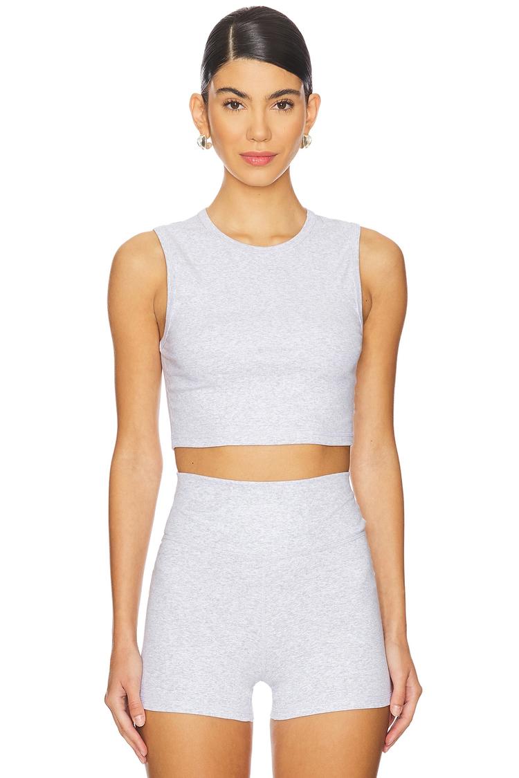 Soft jersey fabric crafted from a nylon-spandex blend offers a fitted, cropped muscle tank ideal for warm weather. Featuring a classic crew neck and sleeveless strapless styling, this minimalist tank pairs effortlessly with high-waisted shorts or leggings. Its pullover design provides ease and comfort, making it a versatile choice for casual outings, workouts, or relaxed loungewear days. The light gray hue adds a subtle sporty chic vibe that complements a variety of styles and occasions.