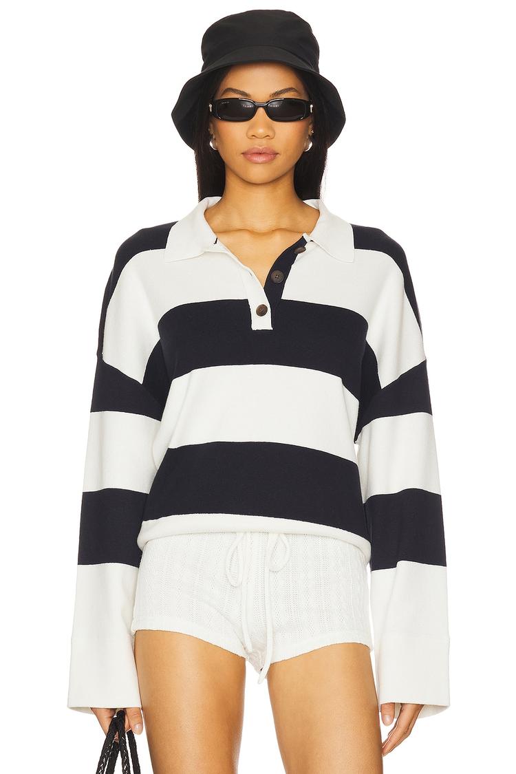 Bold black and white stripes define this classic rugby polo top, crafted from a midweight knit blend of cotton, linen, and recycled polyester for breathable comfort. Featuring a relaxed fit, long regular sleeves, and a ribbed polo collar with partial front button closures, it delivers timeless sporty style with a casual chic edge. The hip-length silhouette and ribbed cuffs and hem add subtle texture, making it a versatile choice for casual outings, travel days, and everyday wear. This staple piece balances comfort and style effortlessly, perfect for layering or standalone wear.