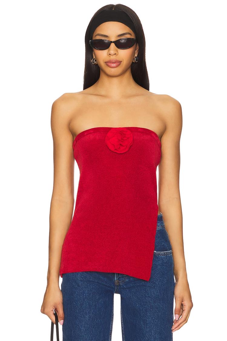 A bold red crushed velvet tube top with a slim fit and strapless neckline offers a chic and sexy silhouette. The tonal ruffled floral detail at the front adds a delicate feminine touch, while the side hem slit enhances the modern edge. Crafted from a midweight polyester-spandex blend, this hip-length top combines comfort with style. Perfect for casual outings, date nights, or an evening out, it brings a sophisticated yet playful vibe to your wardrobe.