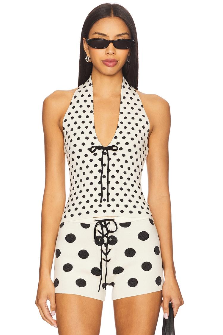 Lightweight knit fabric and a flattering halter neck shape define this slim-fit tank top, adorned with an all-over black polka dot pattern on a creamy base. The sleeveless, waist-length silhouette features a charming front tie bow detail, adding a playful touch to its minimalist design. Ideal for warm spring and summer days, it pairs effortlessly with casual outfits for brunch, vacation, or everyday wear, offering a classic yet chic look with a comfortable knit texture.