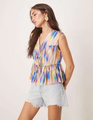 YAS SLEEVELESS TIE FRONT TOP IN MULTICOLOR SMUDGE PRINT