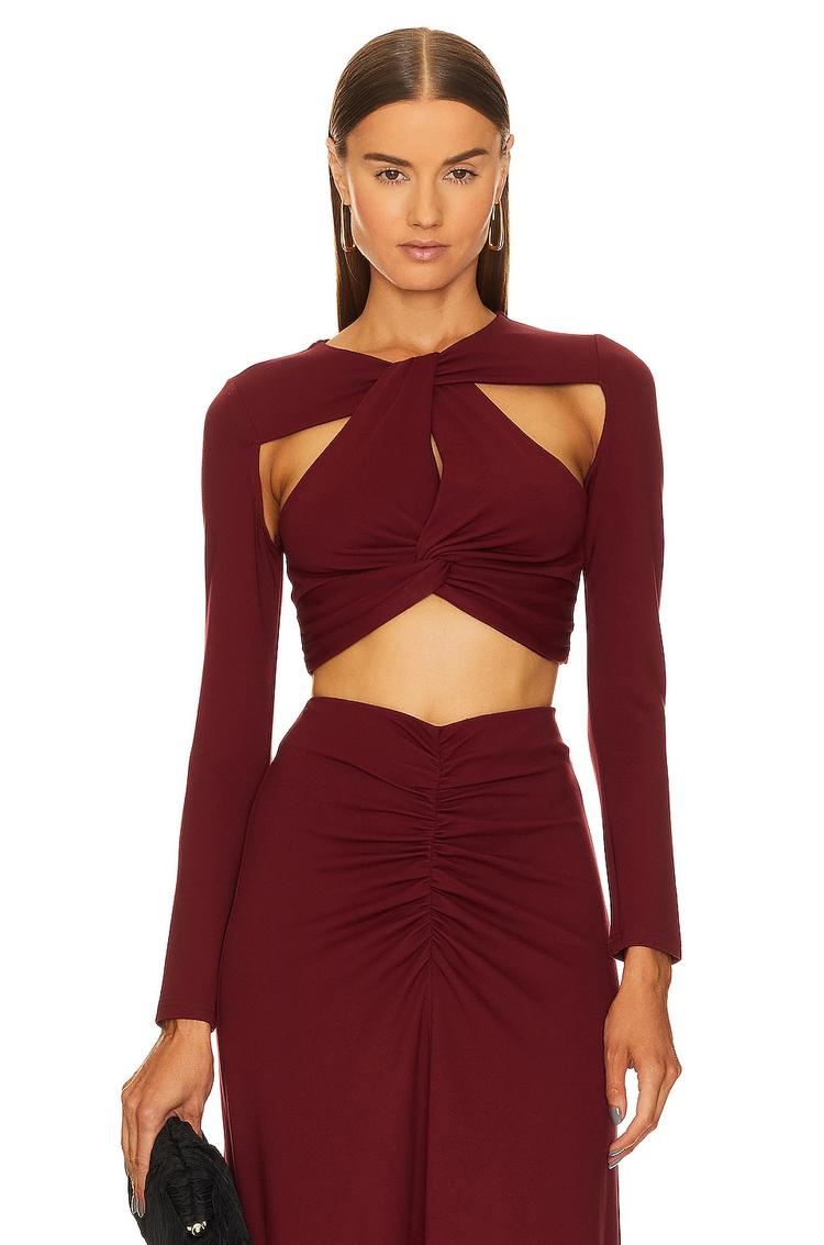 Cut-out details and a fitted silhouette define this matte burgundy cropped top crafted from a midweight polyester jersey fabric. Featuring a round neckline and long regular sleeves, it offers a modern and sexy look with a covered back and pullover closure. Perfect for autumn and winter, this chic crop top suits casual outings, night outs, and date nights with its flattering cut and contemporary style.