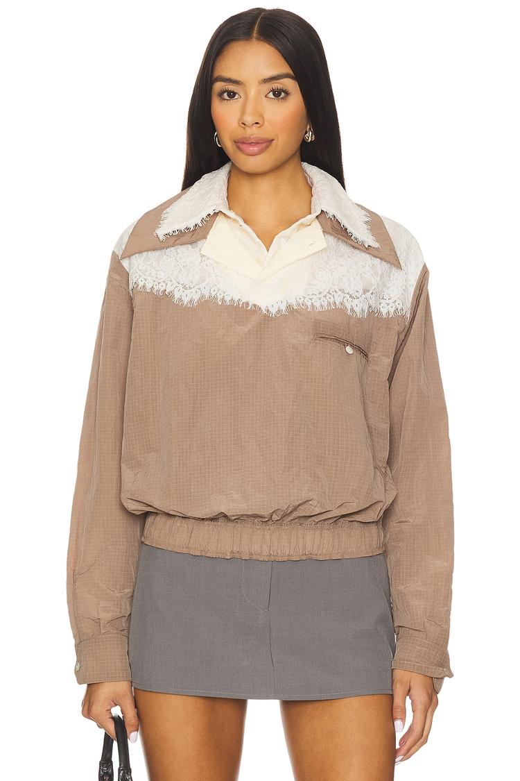 This retro western-inspired blouson top features a relaxed fit with long cuffed sleeves and a unique double collar design. Crafted from smooth matte taupe nylon, it is enhanced with delicate off-white lace trim along the collar and shoulders, adding a classic yet casual chic vibe. The elasticized waistband and pullover styling ensure comfortable wear, while button details on the sleeves and front pocket bring subtle sophistication. Ideal for autumn and spring, this versatile piece suits casual outings, streetwear looks, and business casual settings with ease.