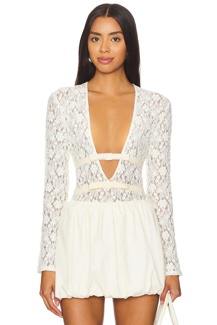 Delicate lace fabric and a plunging neckline define this fitted blouson top, featuring long sleeves and a signature front tie bow detail. The off-white hue and sheer all-over lace create an elegant yet sexy silhouette perfect for night outs, date nights, or girls' night events. Lightweight and waist length, it pairs effortlessly with high-waisted bottoms for a modern, confident look.