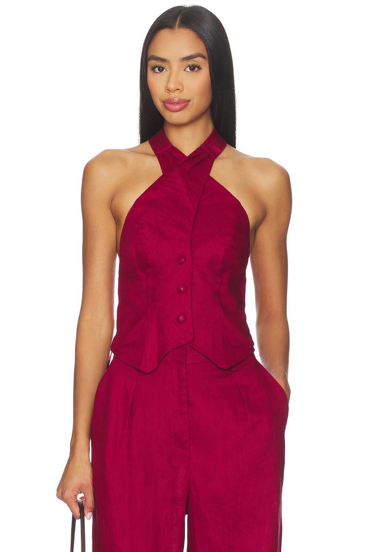 A striking matte dark red corset top crafted from lightweight linen, featuring a fitted silhouette that accentuates the waist. The halter neck design with front button closure adds a chic and modern touch, while the strapless sleeveless style keeps it perfect for warm spring and summer days. This waist-length top pairs effortlessly with casual or dressy bottoms, making it an ideal choice for brunch dates, nights out, and casual gatherings. The minimalist button detailing on the front enhances its classic yet sophisticated appeal.