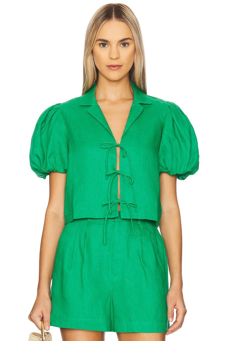 Vibrant green linen meets casual chic in this cropped top featuring a relaxed fit and statement puffed half sleeves. The notched lapel collar adds a modern twist, while the front triple tie-up closure enhances its laid-back vibe. Perfect for spring and summer, its lightweight fabric and cropped length make it ideal for brunch dates, casual outings, and vacation wear.