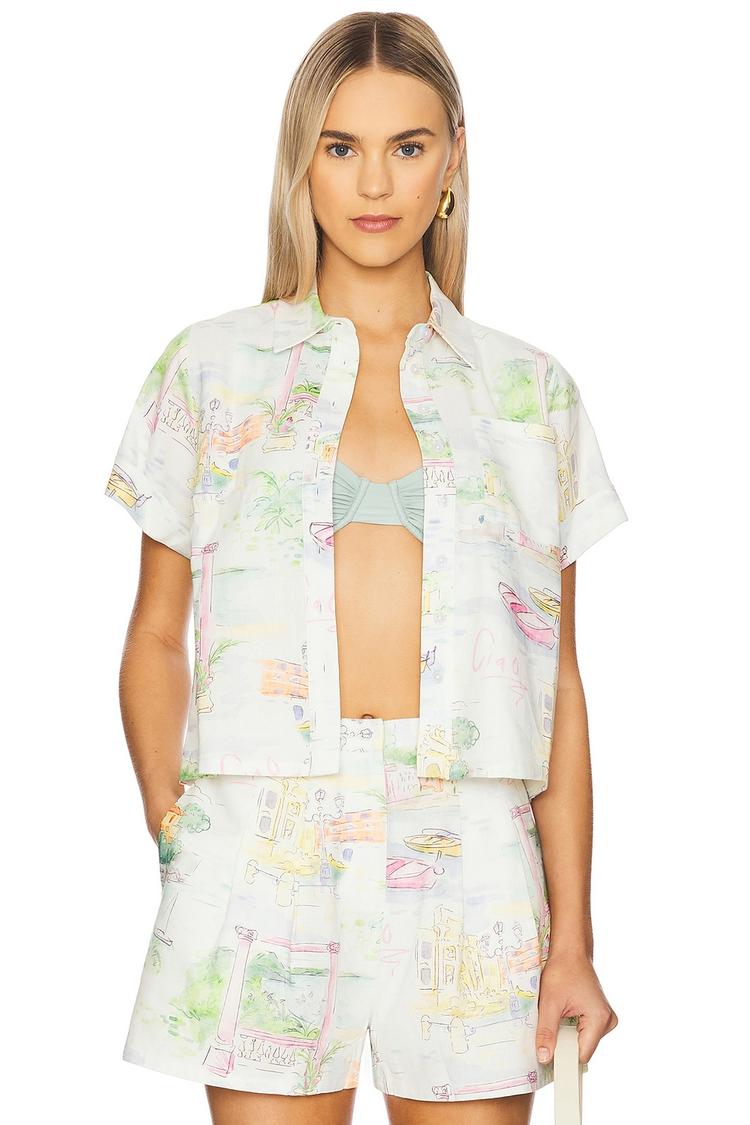 Softly structured with a crisp collar and half sleeves, this cropped boxy top features a delicate abstract print in muted pastels over a white base. Crafted from a midweight blend of rayon, linen, and cotton, it offers breathable comfort and a relaxed fit perfect for spring and summer. The front button closure adds classic charm, while the loose silhouette pairs effortlessly with shorts or skirts for casual chic style. Ideal for everyday wear, loungewear, or vacation, this versatile piece blends minimalist ease with a subtle artistic vibe.