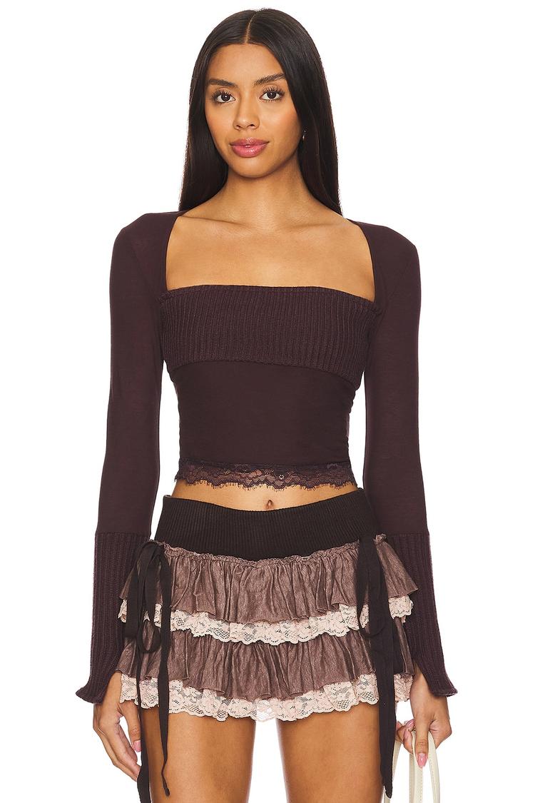Soft ribbed bust and cuffs define this cozy knit top in a rich dark brown hue, crafted from lightweight linen for breathable comfort. Featuring a fitted cropped silhouette with a chic square neckline and long sleeves, its lace trim at the hem adds a delicate feminine touch. Ideal for casual outings, brunch dates, or relaxed evenings, this pullover knit blends ease and elegance for versatile wear across spring and autumn seasons.