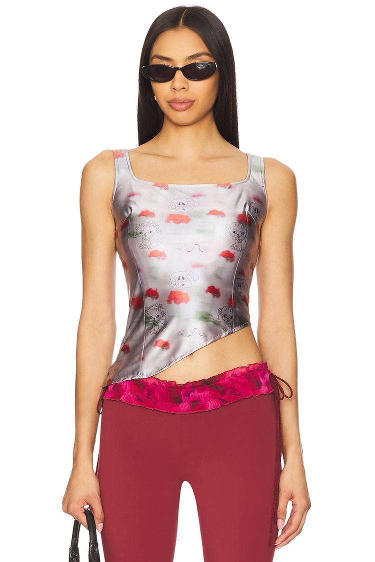 Shimmering satin fabric and a fitted silhouette highlight this asymmetric cropped top with a striking square neckline and sleeveless wide straps. The all-over floral print in vibrant red accents the sleek silver base, while the self-tie closure at the back adds a chic, adjustable detail. Its unique asymmetrical hem makes it a trendy choice for spring to autumn wear. Ideal for casual outings, brunch dates, or night out events, this modern piece blends eye-catching style with versatile comfort.