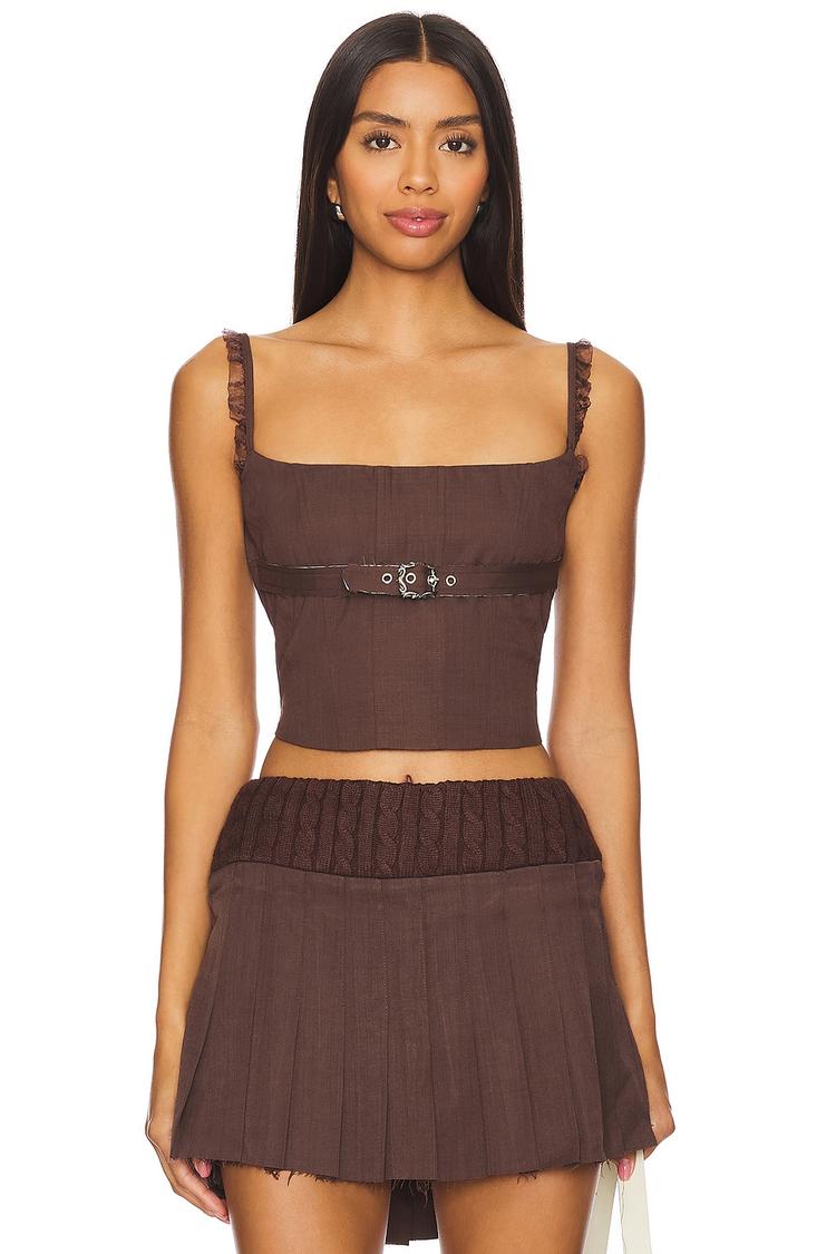 Crisp suiting fabric and a fitted corset silhouette define this cropped bustier, featuring a square neckline and adjustable shoulder straps trimmed with delicate lace. The lace-up back and hidden side zipper ensure a perfect fit, while the front buckle accent adds a chic modern touch. Ideal for spring and summer, this versatile piece pairs effortlessly for casual outings, brunch dates, or night outs, offering a trendy yet elegant look with a matte brown finish and refined design details.