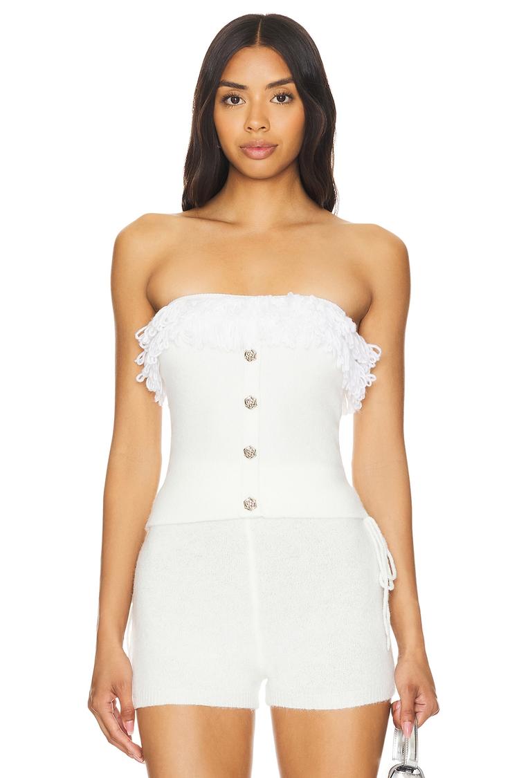 Soft knit fabric and a fitted silhouette combine in this chic tube top featuring a straight neckline with playful fringe detail along the collar. The front silver-tone rose buttons add a subtle touch of elegance to the waist-length design. Perfect for spring and summer, this strapless piece suits casual outings, brunch dates, and night outs with a trendy yet cute vibe. Its versatile style and breathable fabric make it an effortless choice for warm-weather wardrobes.