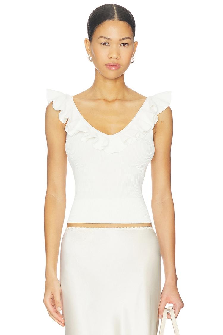 Soft ribbed jersey fabric and a fitted silhouette highlight the flattering darted waist of this elegant sleeveless tank. The romantic V-neckline is framed by delicate ruffled sleeves and collar details, adding a feminine touch to its classic white hue. Ideal for spring and summer days, this waist-length top is versatile enough for casual outings, brunch dates, or everyday wear with a subtle sophisticated vibe.