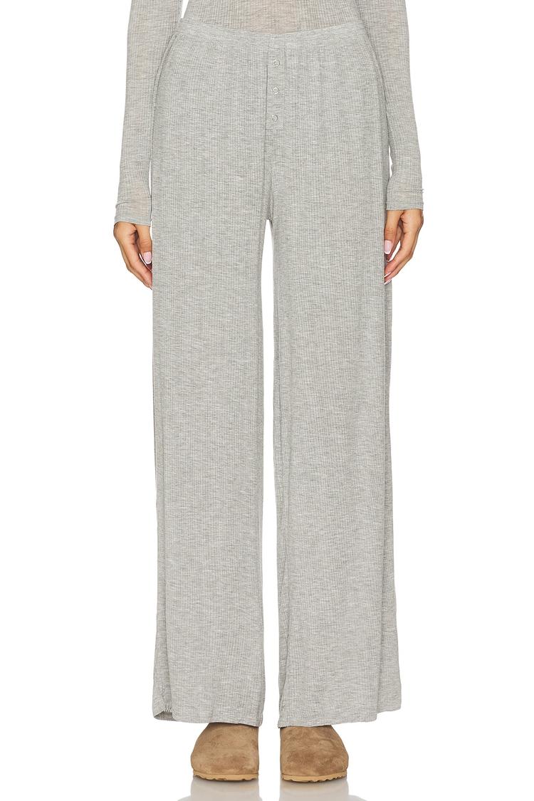 Effortless comfort meets modern ease in these whipped track pants. Crafted in a soft, heather gray ribbed modal blend with LYCRA for a gentle stretch, they hug the waist in a pull-on silhouette with a subtle faux fly for a sleek, minimalist look. The wide, flowing legs fall to a full length, delivering a relaxed drape that moves with you from morning errands to relaxed weekends. Pair with a cropped top or oversized knit for a casual-chic vibe, or slip on sneakers for a laid-back city-ready outfit. A versatile staple that blends comfort with restrained polish.