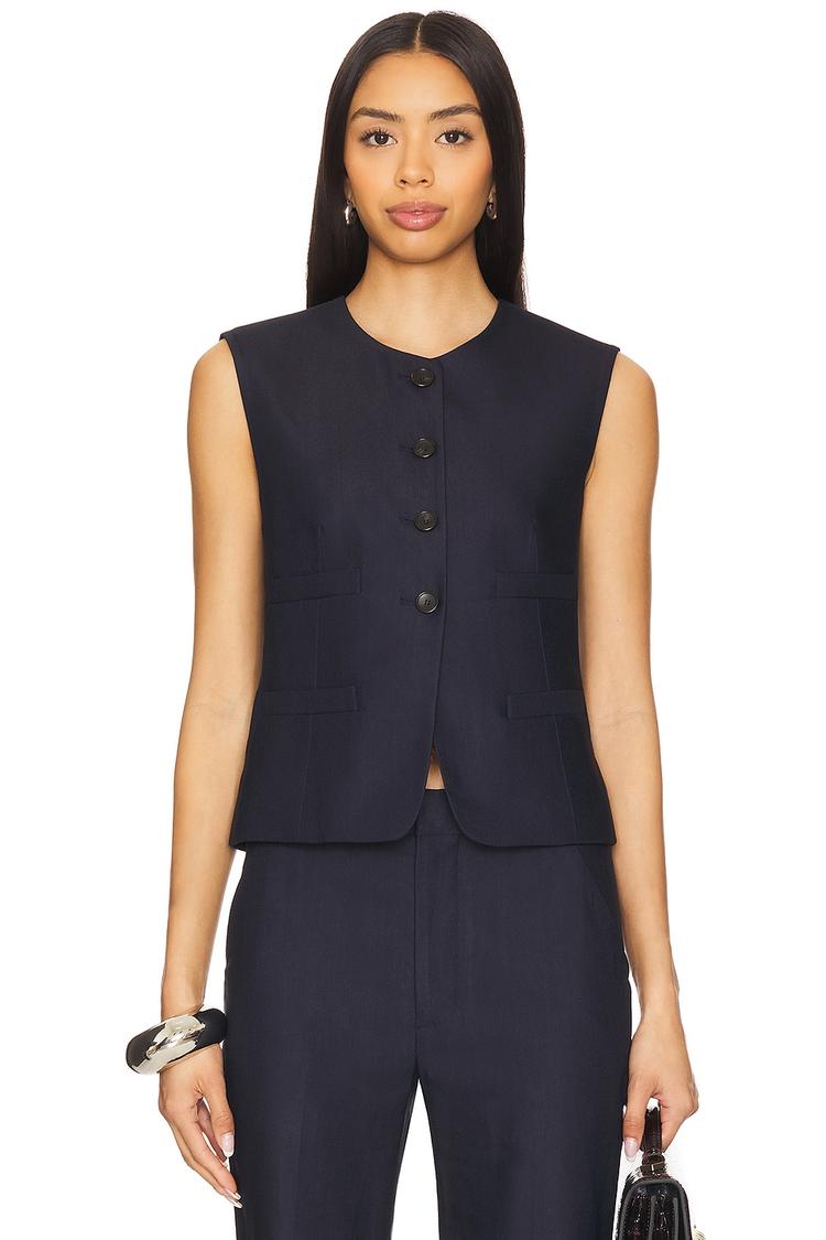 This classic Georgie Vest features a fitted silhouette with a waist-length cut and sleeveless design, crafted from a midweight viscose-cotton suiting fabric. It has a round neckline and a front button closure with welt pockets for functionality. The vest's covered back and solid black color emphasize its minimalist and sophisticated style, perfect for workwear, business casual, or conference settings. This tailored vest provides a polished layering option suitable for all seasons.