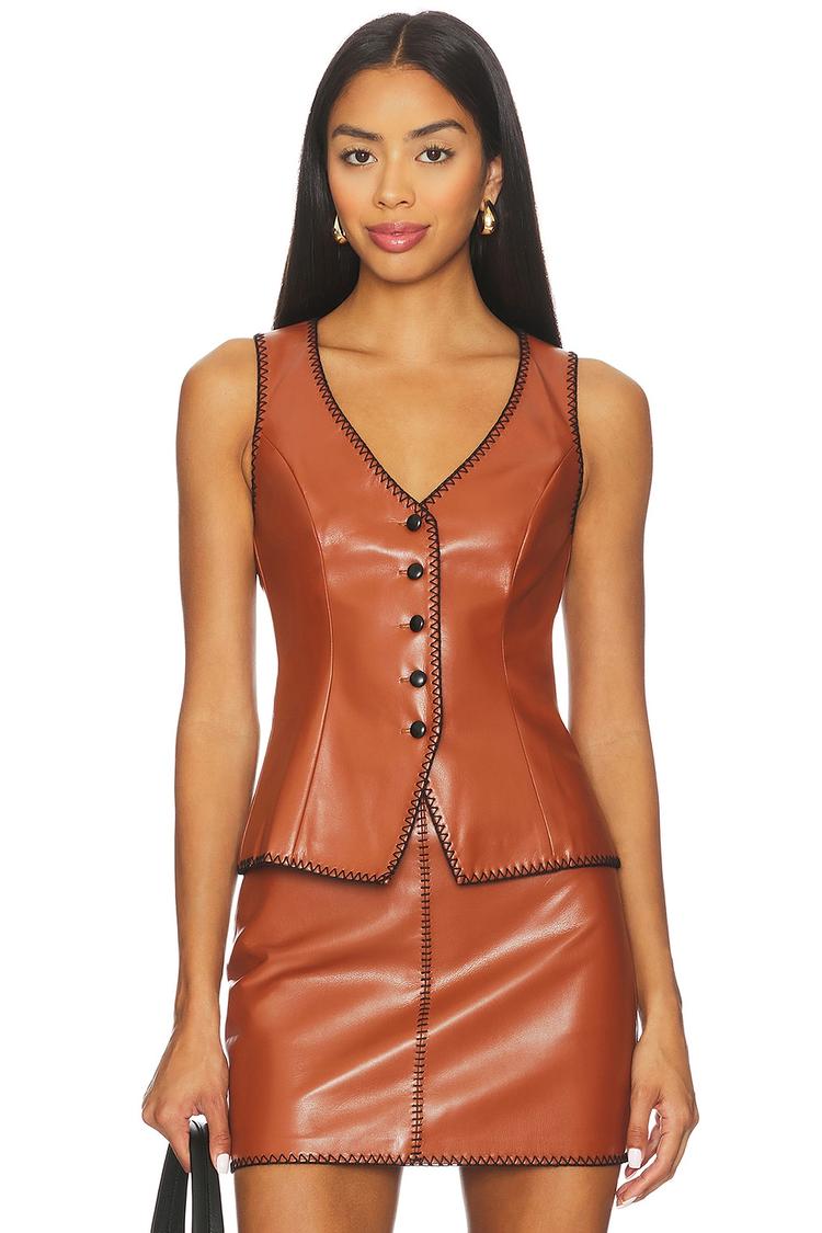 This cropped vest features a sleek V-neck design and a front button closure, crafted in a matte brown midweight faux leather fabric with contrast black stitching detail all over. The sleeveless silhouette and tailored cropped fit make it ideal for layering in autumn and spring. Fully lined with polyester, this vest embodies a modern classic chic style suitable for casual outings, business casual settings, or a stylish night out. Its covered back and clean lines ensure a polished look that elevates any ensemble with minimalist sophistication.