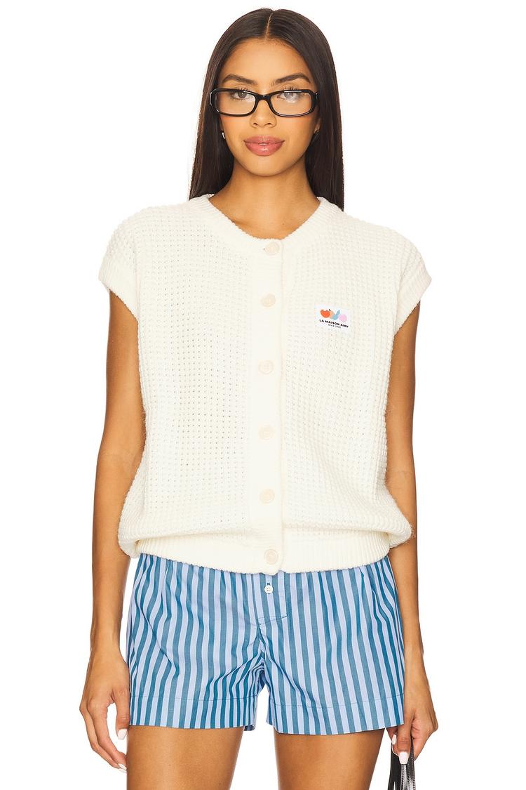 This cropped vest features a midweight semi-sheer knit fabric crafted from a wool, alpaca, and polyacrylate blend. It presents a classic V-neckline with ribbed trim and a front button closure. Sleeveless and with a covered back, the vest offers a minimalist, textured silhouette ideal for layering. The cream tone and front logo patch add subtle detail, making it suitable for casual, loungewear, and workwear occasions during autumn, winter, and spring.