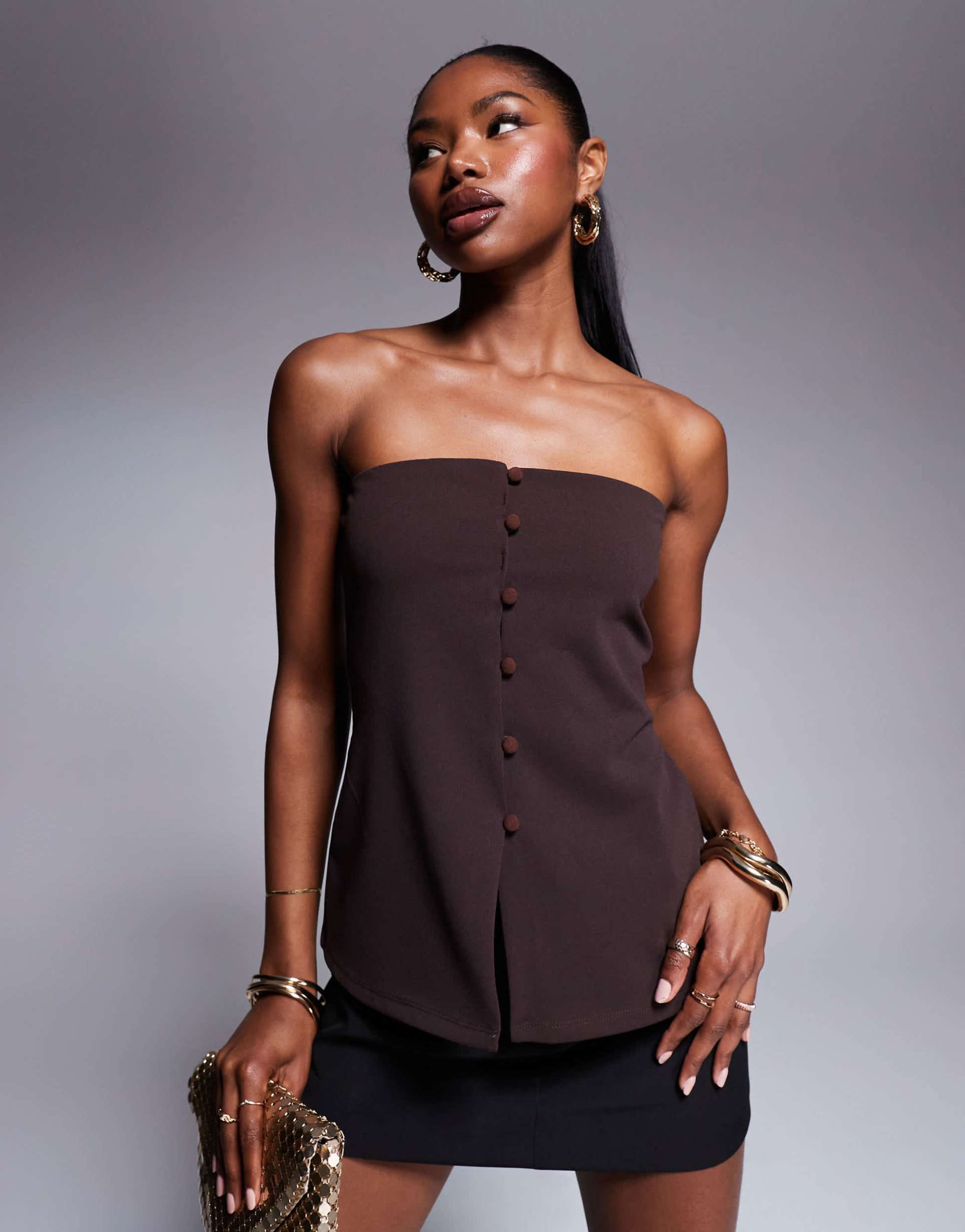 Soft and stretchy polyester jersey defines this modern bandeau top with a chic strapless neckline and button placket down the front. The regular fit and hip-length silhouette with a split hem add ease and style, making it a versatile choice for date nights, casual outings, or night events. Its minimalist design and matte brown hue offer a sleek, contemporary vibe that pairs effortlessly with various bottoms for a polished look.