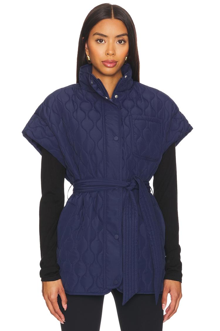 This Glenn Vest features a quilted puffer silhouette with a stand collar and sleeveless drop-shoulder styling, perfect for layering in cooler seasons. The hip-length cut and adjustable waist tie create a flattering adjustable fit. Crafted from polyester gabardine with polyester lining, it includes a front zipper with snap button closure and functional pockets, combining practicality with style. Its solid navy hue and all-over quilting detail offer a modern minimalist look ideal for casual wear, travel, and streetwear occasions.