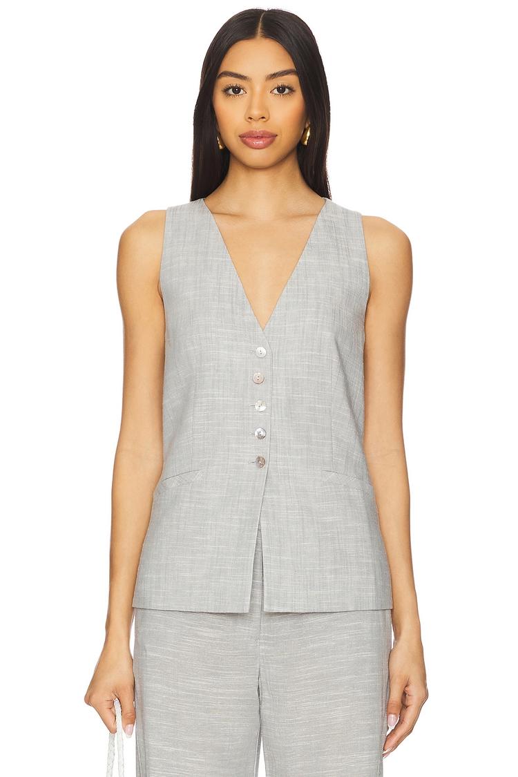 This tailored Maicie vest features a sleek V-neckline and sleeveless design crafted from a lightweight blend of rayon, linen, and cotton with a soft cotton lining. Its hip-length silhouette and front button closure create a polished, minimalist look ideal for business casual and workwear settings. The vest includes dual faux welt pockets for subtle functionality, making it perfect for spring through autumn layering. Its matte light gray hue lends a sophisticated, timeless appeal suitable for both professional and casual occasions.