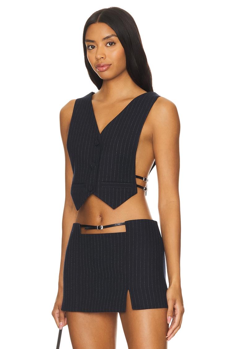 This fitted striped vest features a classic V-neck and front button closure, crafted from a sleek polyester blend. Its waist-length silhouette is enhanced with side buckle accents, adding subtle edgy detail to the minimalist pinstripe pattern. The covered back maintains a clean finish, making it versatile for business casual settings, brunch outings, or casual wear. Ideal for layering in all seasons, this vest brings a modern twist to timeless tailoring.
