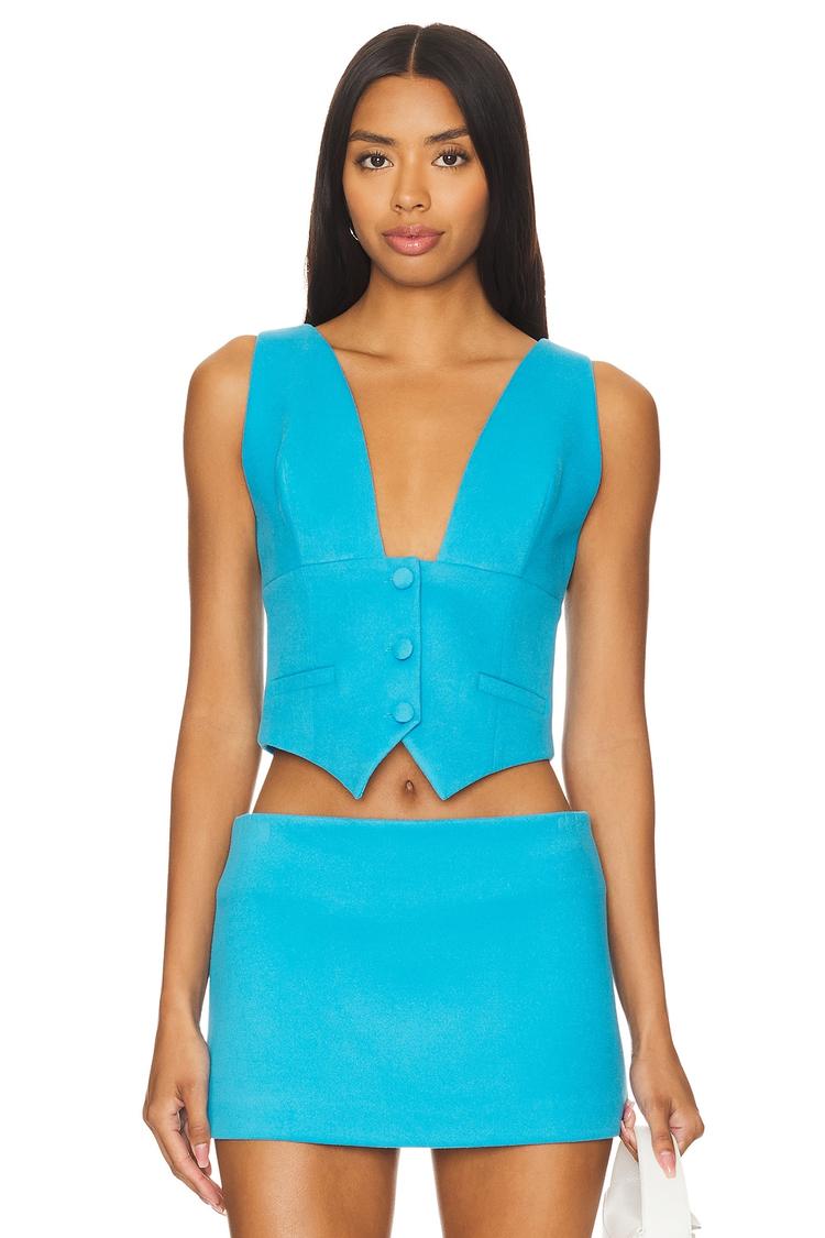 This modern, fitted vest in a bright blue gabardine fabric offers a sleek cropped length and sleeveless design perfect for warmer seasons. Featuring a deep V-neckline and front button closure, it creates a chic and sexy silhouette ideal for casual outings, date nights, and night out occasions. The vest is fully lined with polyester and has a covered back style, emphasizing clean lines and minimalist appeal.