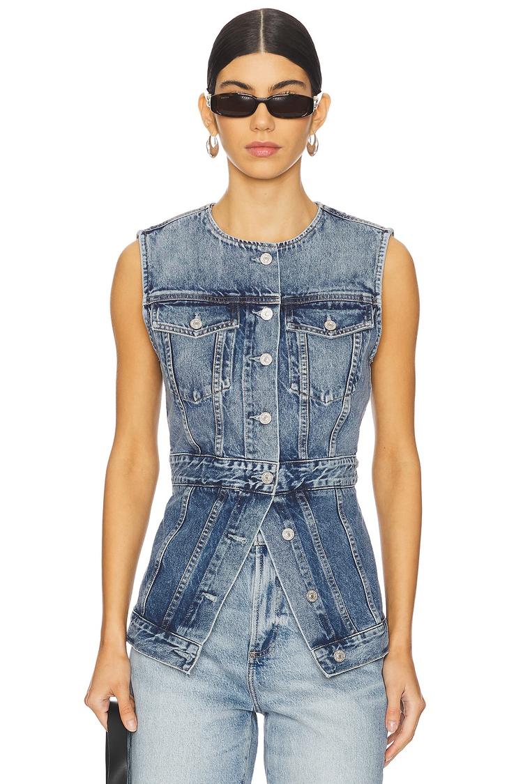 This sleeveless peplum vest crafted from rigid cotton denim features a fitted silhouette that cinches at the waist for a flattering shape. It has a classic round neckline and a single-breasted front button closure with breast flap pockets, adding functional style. The hip-length cut and textured denim fabric give it a modern yet timeless appeal, suitable for casual streetwear and travel. The vest’s clean solid blue color and patch design details on front and back enhance its casual chic vibe, making it perfect for spring through autumn layering.