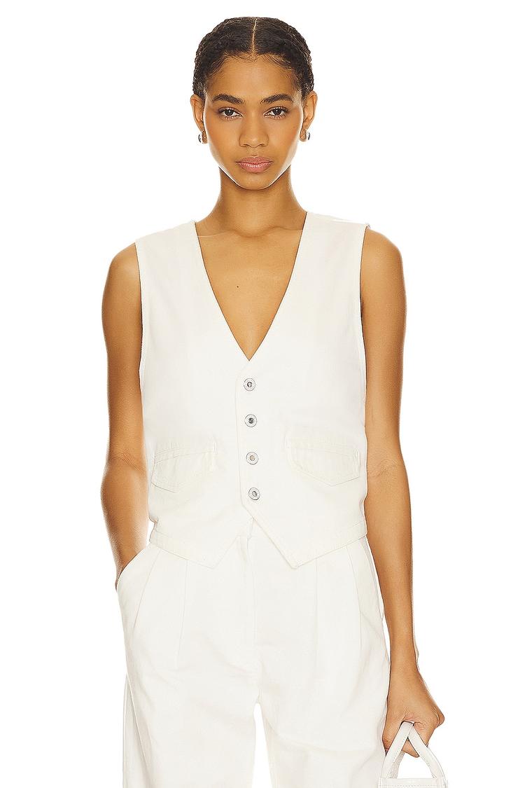 This fitted off-white vest features a lightweight cotton denim fabric with a classic V-neck and sleeveless design. It closes with front buttons and includes functional flap pockets on the front. The kerchief hem adds a subtle design detail for a modern touch. The back is simple and covered, maintaining a clean silhouette. Perfect for casual outings, brunch dates, or smart-casual workwear in spring through autumn, this vest pairs effortlessly with matching or contrasting bottoms for a polished yet relaxed look.