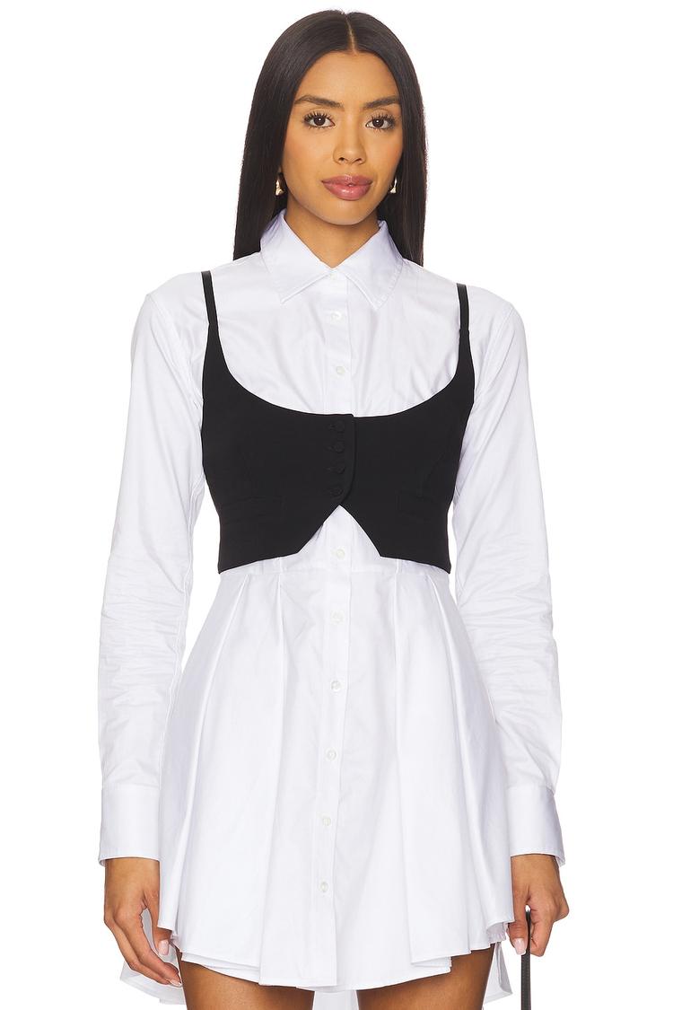 This modern cropped vest in black features a fitted silhouette with adjustable straps and a powermesh covered back for a sleek, sophisticated look. Crafted from a luxurious blend of recycled polyester, silk, viscose, and nylon, it offers comfort with a smooth lining of viscose and polyester. The vest closes with exposed front buttons and includes faux front pockets, making it a versatile layering piece ideal for casual outings, business casual settings, or stylish date nights. Sleeveless and cropped, it pairs perfectly over shirts or dresses to add a chic, contemporary edge.