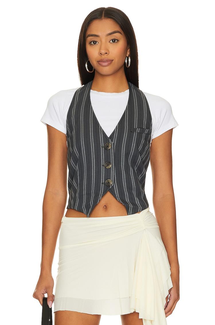 This Dakota vest features a fitted, waist-length silhouette with a classic V-neck and front button closure paired with side lace-up tie details. Crafted from a lightweight polyester and viscose twill fabric, it showcases a timeless black base with white pinstripes all over. The sleeveless design and tailored fit make it ideal for layering over tees or blouses. Perfect for casual outings, business casual settings, or weekend brunches during spring, summer, and autumn seasons.