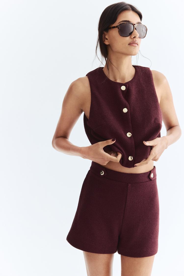 This textured jersey waistcoat in a rich dark burgundy hue features a fitted silhouette with a classic round neckline and sleeveless styling. The waist-length vest is fastened with distinctive buttons that add a subtle accent to its minimalist, modern design. Crafted from soft, textured jersey fabric, it offers comfortable layering ideal for casual, workwear, or business casual occasions during autumn, winter, and spring seasons.