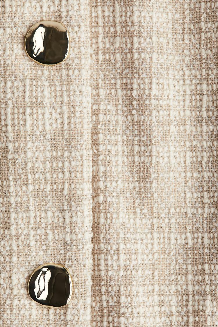 This cropped jersey vest features a classic round neckline and a fitted silhouette that highlights the waist. Crafted from textured jersey fabric with a subtle checkered pattern in beige and brown tones, it fastens with buttons on the front. Sleeveless and designed for spring and autumn wear, this minimalist and chic piece is perfect for casual outings, business casual settings, or a stylish brunch. Its textured surface adds a refined touch to the overall look.