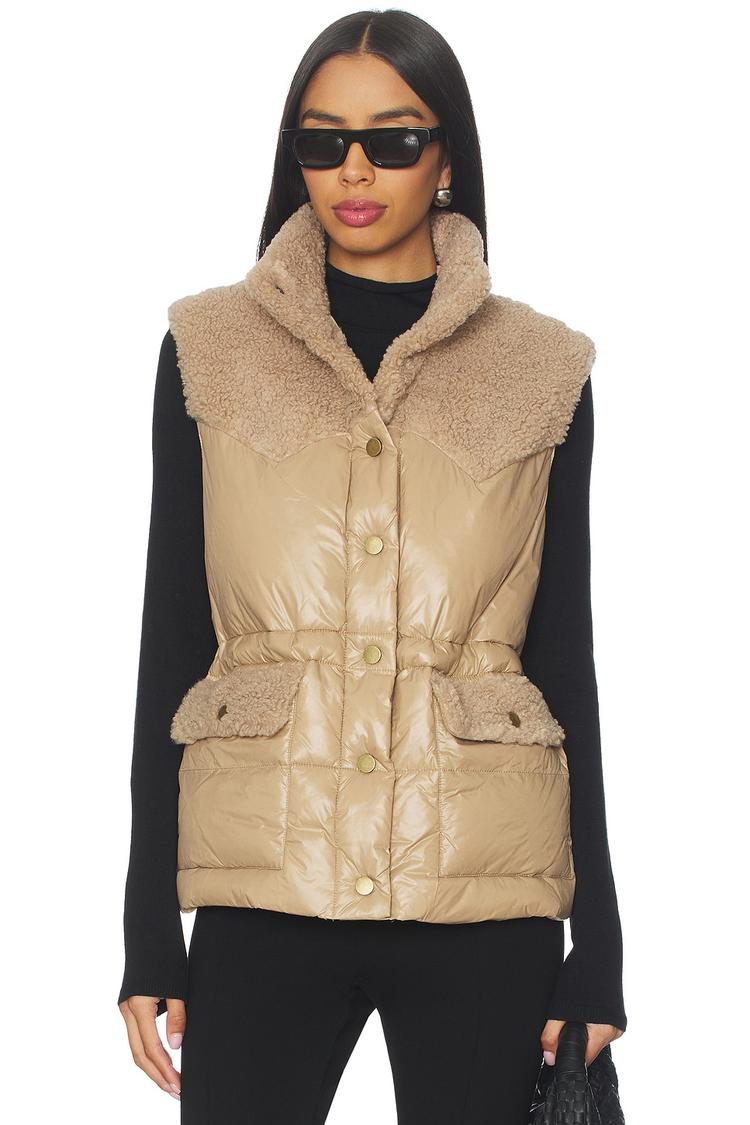 This Alex Vest features a hip-length puffer-quilted silhouette in a beige nylon and polyester shell with polyester lining. Designed without sleeves, it has a stand collar and snap button closure for easy wear. The adjustable waist enhances fit, while quilting adds texture throughout. The collar and yoke area showcase a contrasting bouclé-like textured fabric, lending a modern, casual chic vibe. Ideal for autumn and winter, this vest suits casual outings, travel, and streetwear styling, combining warmth and style with practical pockets and a versatile look.