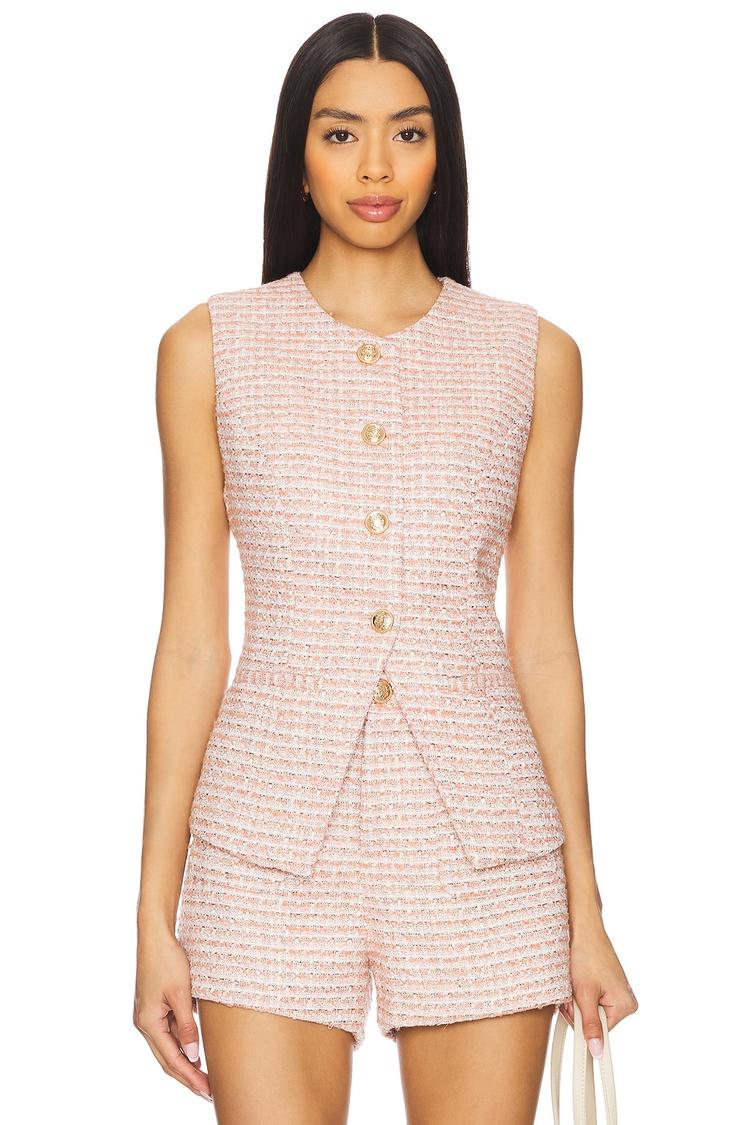 This Emerson Vest features a fitted silhouette in shimmering dusty rose tweed fabric with metallic threading throughout. The sleeveless design and hip-length cut create a polished look perfect for layering. It includes a round neck and front button closure, complemented by dual faux welt pockets for subtle functionality. The vest is lined with polyester for comfort and structure. Ideal for casual outings, business casual settings, and brunches, this classic and elegant piece adds refined texture and style to your wardrobe for spring and autumn seasons.