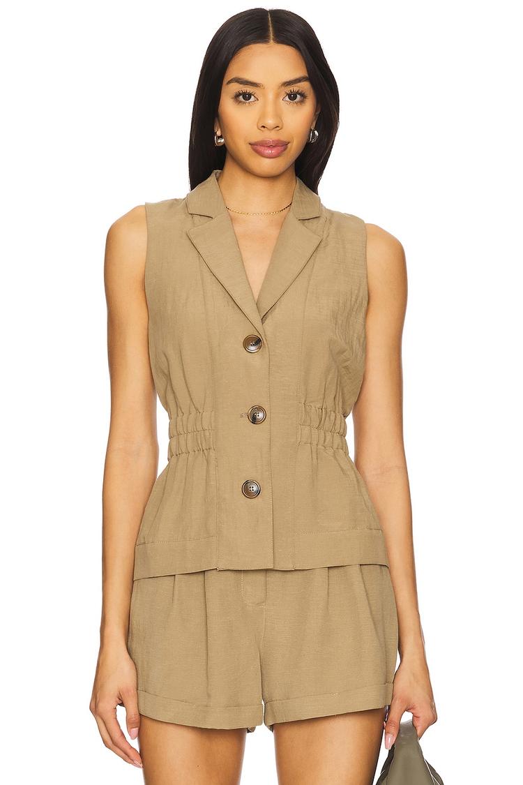 This tailored vest features a matte tan finish with a classic notch lapel and a fitted silhouette that cinches at the elasticized waist for a flattering shape. Crafted from a lightweight blend of lyocell, rayon, linen, and polyester, it offers breathable comfort perfect for spring through autumn. The sleeveless design and front button closure enhance its minimalist appeal, making it a versatile piece for casual, business casual, or workwear occasions. Its waist-length cut pairs seamlessly with shorts or trousers, delivering effortless style with a polished edge.
