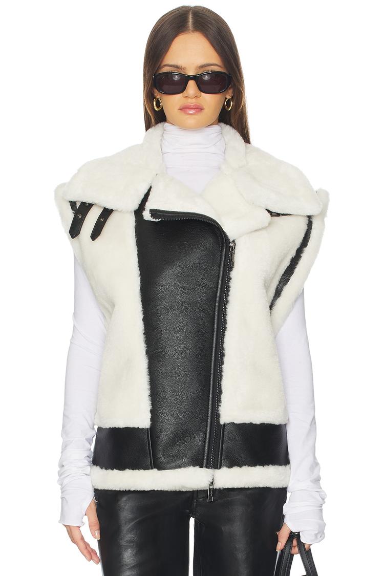 This edgy biker-moto vest features a relaxed fit and hip-length silhouette crafted from matte black faux leather and cream faux shearling. The sleeveless design highlights an oversized collar, while asymmetrical front zipper closure and side zip pockets add functional style. Textured faux shearling trims the hem and collar, enhancing the modern, casual chic vibe. Perfect for layering in autumn, winter, or spring, it suits casual outings, streetwear looks, and travel with ease.