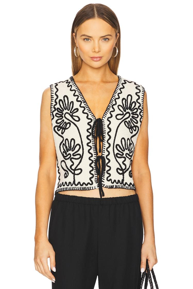 This Maris Vest features a regular fit and waist-length silhouette with a sleeveless design perfect for layering. Crafted from midweight polyester poplin, it showcases intricate black embroidery detailing along the front and trim borders, adding a bohemian flair. The V-neckline and dual front tie closures provide a casual yet chic appeal. Its cream base with striking black contrast makes it an excellent choice for casual outings, brunches, and streetwear looks during spring to autumn seasons.