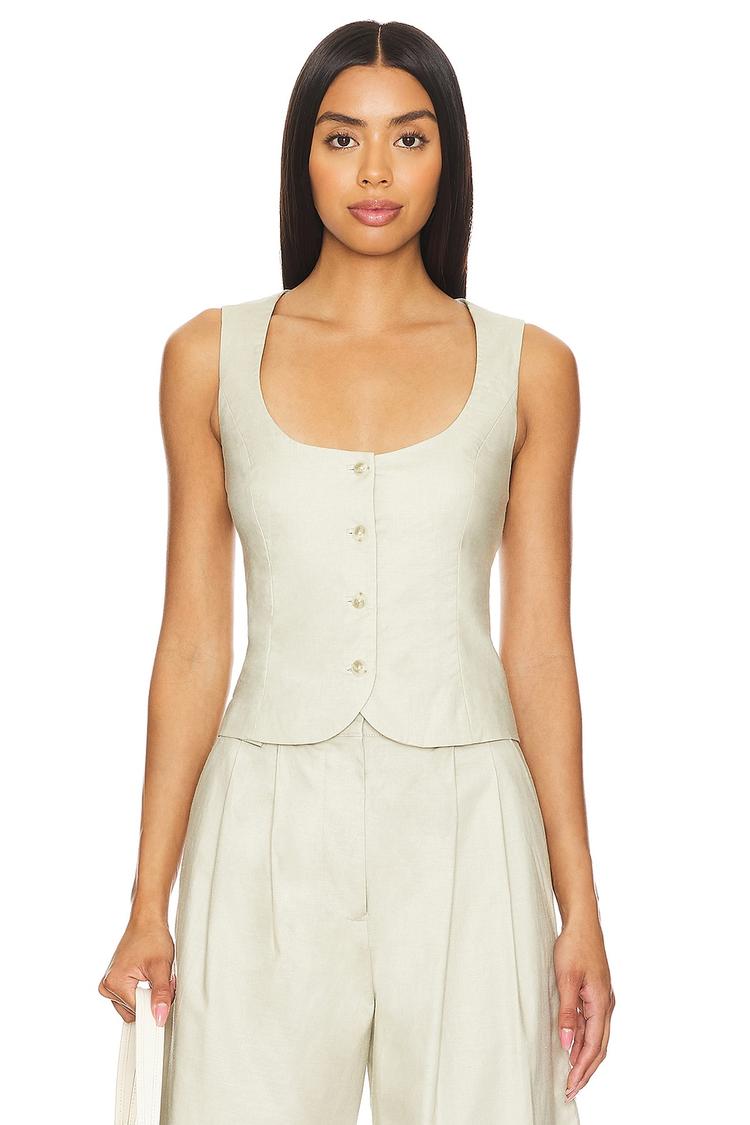 This fitted vest in a soft cream hue features a round neckline and front button closure, crafted from a smooth blend of viscose, linen, and rayon lining. Sleeveless and waist length, it offers a classic minimalist style with a covered back silhouette. Ideal for casual, business casual, and brunch occasions during spring, summer, or autumn, this vest pairs effortlessly with tailored pants or skirts for a polished look.