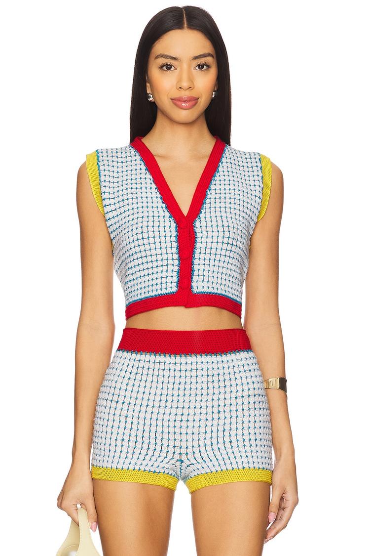 This hand-crochet vest features a fitted, cropped silhouette with a vibrant V-neckline and front button closure. Crafted from midweight crochet fabric, it showcases an all-over checkered pattern in white with bold red and yellow trim accents on the neckline and armholes. Sleeveless with a covered back, this vest embodies a bohemian casual chic style ideal for spring and summer seasons. Perfect for casual outings, loungewear, or vacation wear, it pairs beautifully with high-waisted shorts or layered over light tops for a relaxed yet stylish look.