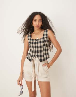 A timeless gingham corset top featuring a classic square neck and button-up front, crafted from lightweight, soft cotton. Its regular fit and sleeveless wide straps offer comfort and style perfect for spring and summer days. The monochrome checkered pattern adds a minimalist yet chic touch, making it an ideal choice for casual outings, brunch dates, or everyday wear.