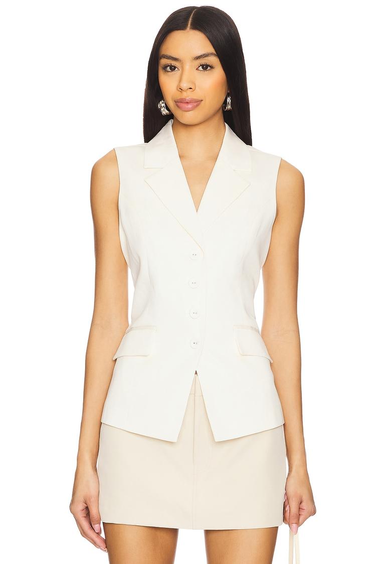 This tailored single-breasted vest features a crisp white hue and a fitted silhouette that flatters the waist. Crafted from a midweight crepe fabric blend of lyocell and cotton with a rayon lining, it offers a smooth, sophisticated finish. The sleeveless design complements the notch lapel collar and front button closure, while front flap pockets add practical style. Hip-length and streamlined, this vest is ideal for workwear, business casual, and conference occasions, delivering a minimalist yet polished look perfect for layering or standalone wear.
