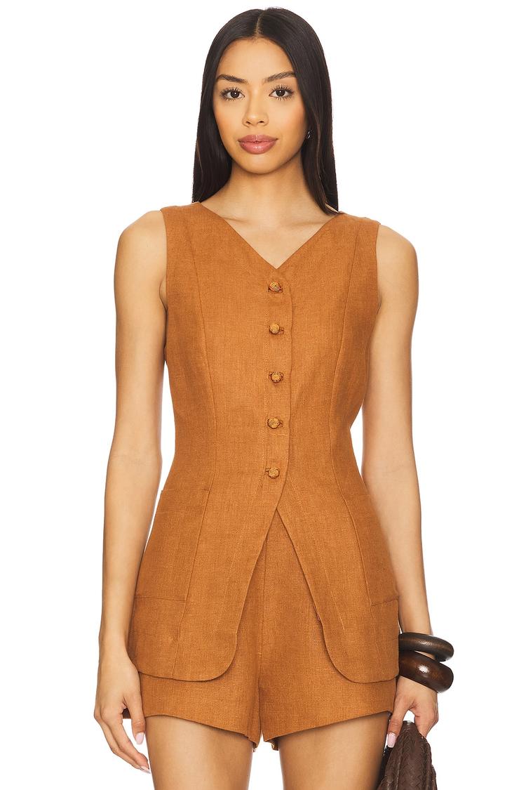 This tailored vest in matte tan linen offers a sleek, sleeveless silhouette with a flattering V-neckline and front button closure. Designed with front patch pockets and an adjustable strap at the back featuring a gold-toned buckle, it combines classic minimalism with functional elegance. The vest is fully lined in soft cotton for comfort and hits at hip length, making it a versatile piece for casual outings, business casual environments, or stylish workwear layering during spring, summer, and autumn seasons.