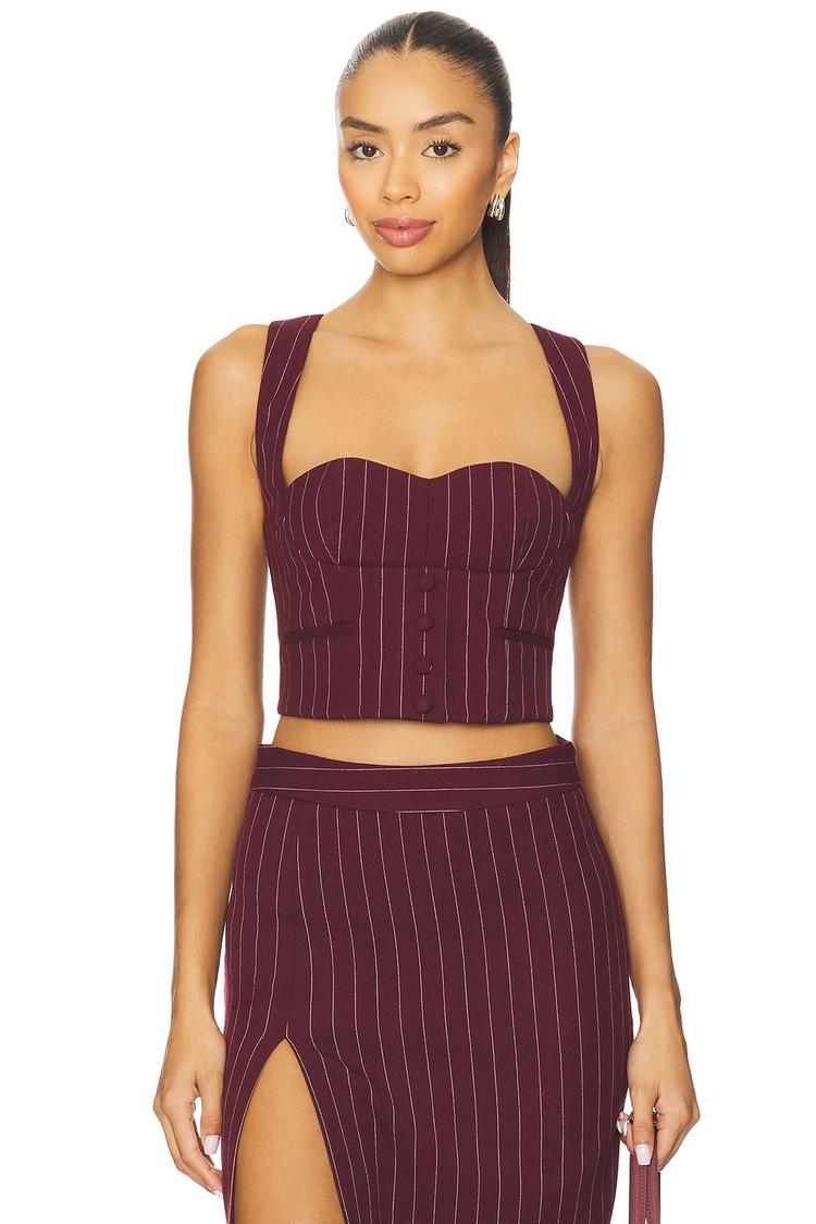 This fitted vest features a chic square neckline and sleeveless design, crafted from a polyester-spandex-viscose blend with a smooth twill texture. Its cropped length and striped pattern in dark burgundy with light beige pinstripes deliver a sophisticated retro vibe. Functional side zipper and faux button front closure blend style and ease, while a buckle accent at the covered back adds subtle detailing. Lightly padded cups provide shape, making this vest perfect for casual outings, business casual settings, or brunch occasions.