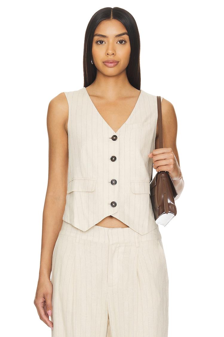 This tailored, waist-length vest features a classic V-neck and sleeveless design, crafted in a lightweight linen and cotton blend with subtle beige stripes all over. The front button closure and flap welt pockets add sophisticated, functional details, while the fully covered back maintains a sleek silhouette. Perfect for business casual or workwear settings in spring through autumn, this minimalist vest brings timeless elegance and breathable comfort to your layered outfits.