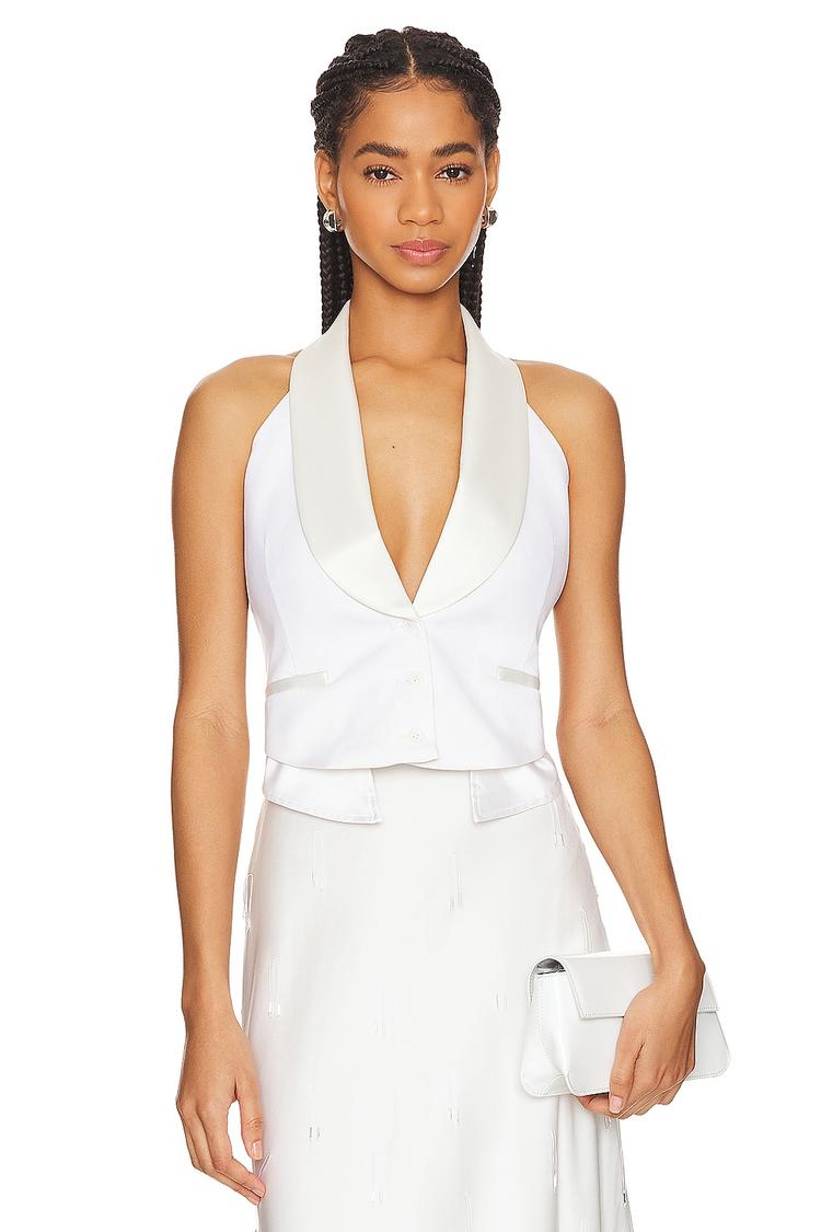 This Albany Shawl Lapel Vest features a crisp white, lightweight suiting fabric blend of wool, polyester, and viscose, tailored to a fitted silhouette. The halterneck design with a shawl collar and front button closure highlights an elegant neckline, while an adjustable back strap ensures a perfect fit. Waist-length and sleeveless, it includes front welt pockets for added style and function. With its open back, this vest is ideal for spring and autumn business casual settings, workwear, and cocktail occasions, delivering sophistication with a modern edge.