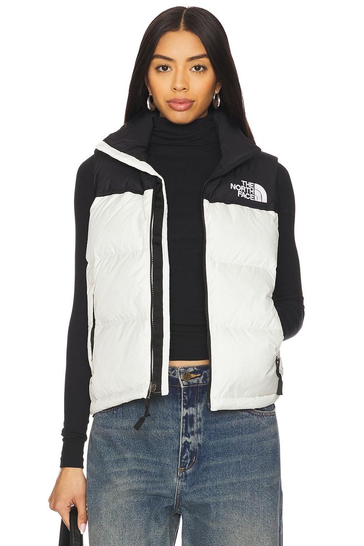 This North Face 1996 Retro Nuptse Vest features a classic puffer-quilted design with a regular fit and waist-length cut. Crafted from midweight ripstop nylon with recycled down and waterfowl feather filling, it offers insulated warmth without sleeves. The stand collar and front zipper closure enhance its sporty chic appeal, while front zip pockets provide practical storage. Embroidered logo detailing adds a signature touch to the solid black and white color-blocked vest. Ideal for casual outings, travel, and outdoor events during autumn through spring seasons.
