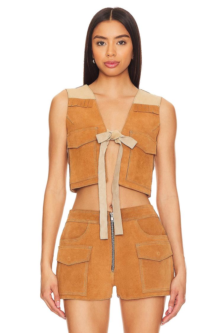 This cropped suede vest combines midweight real leather with a minimalist silhouette and a fitted cut. Featuring a V-neckline and sleeveless design, it closes at the front with a tie-up detail for adjustable styling. The matte tan leather fabric adds natural texture, complemented by practical breast flap pockets on the front for a casual chic vibe. Fully lined with polyester, this vest is perfect for spring and autumn layering, suited for casual streetwear and brunch occasions where understated style meets functional design.